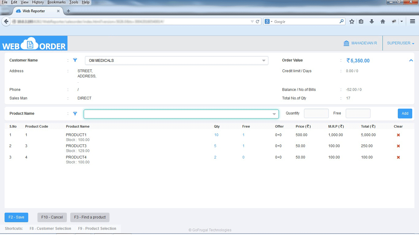 - Save your order processing time and costs with online ordering using GOFRUGAL's WebOrder which will enable your customers and sales reps to order 24*7 directly through the web based tool