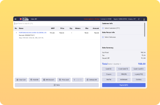 • Blazing speed billing with the help of quick search of items with the item name, brand name, Item code and add new customers quickly