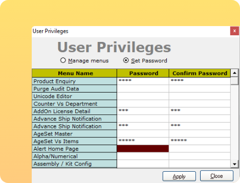 Hierarchical user privilege management by configuring role-wise and user-wise access control. Protects each menu, screen, and operation with a password