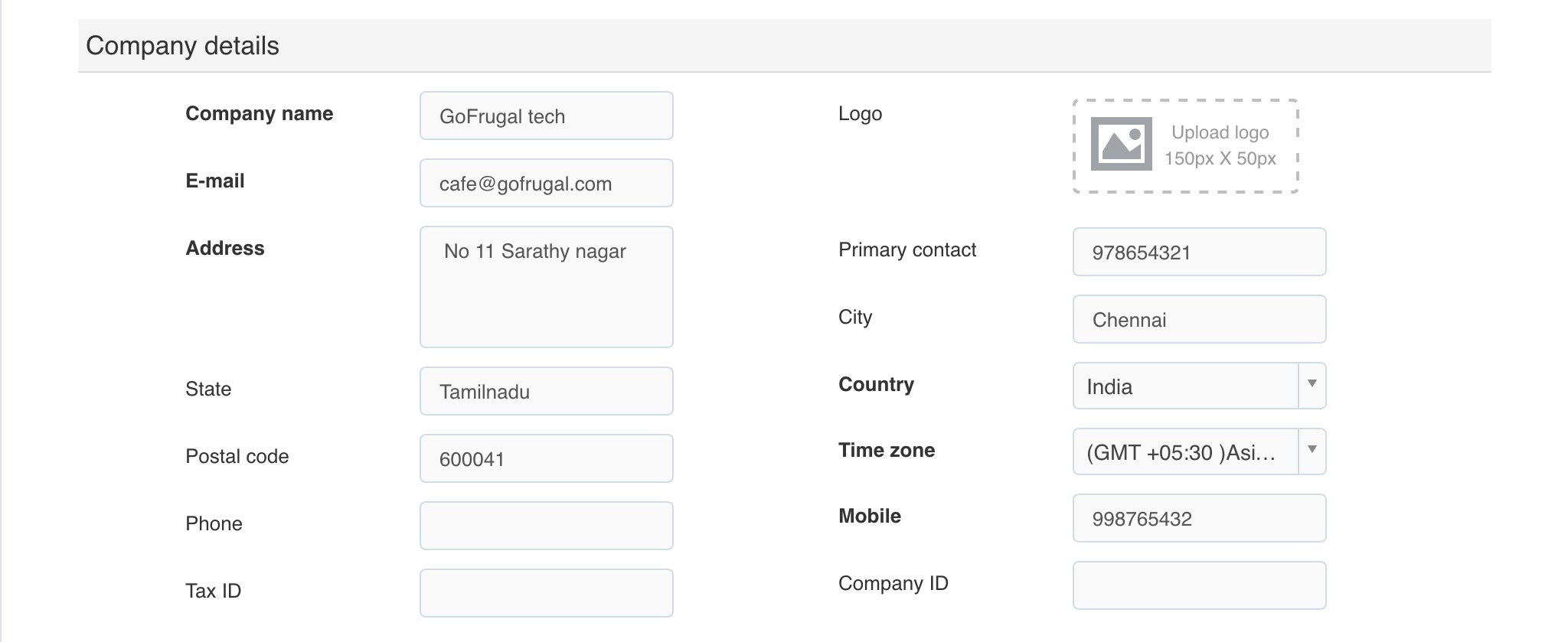 The Company details section, contains fields Company name, Logo, E-mail, Address, Primary contact, City, State, Country, Postal code, Time zone, Phone, Mobile, Tax id, Company idIn the Company name field, enter the company nameIn the Logo field, upload the company logo by selecting UploadIn the E-mail field, enter the e-mail idIn the Address field, enter the address of the companyIn the Primary contact field, enter the contact number of the companyIn the City field, enter the city in which the company residesIn the State field, enter the state in which the company residesIn the Country field, select the country in which the company resides.In the Postal code field, enter the relevant postal code of the companyIn the Time Zone field, select the relevant timezone of your country from the drop down listIn the Phone field, enter the contact phone numberIn the Mobile field, enter the mobile numberIn the Tax id field, enter the tax id number issued for the companyIn the Company id field, enter the registered id of the company