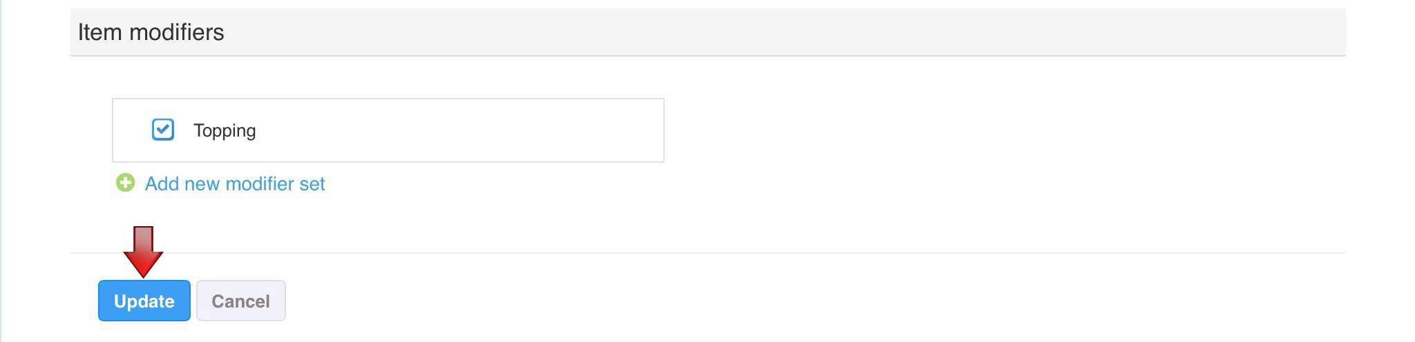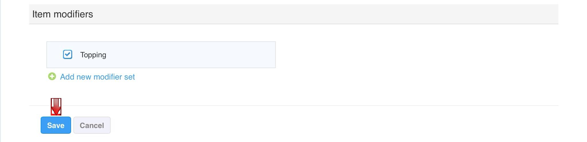 The Item modifiers section, allows to map Modifiers to the Item that is created.Select a Modifier from the available ones by checking the tick box(or) create a new Modifier following the link 3. Select
