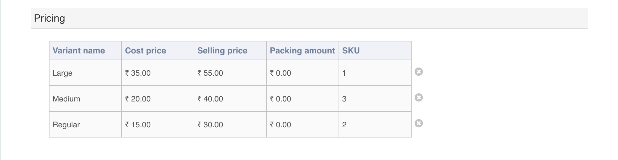 Any number of Variant can be added to an item and their Cost price, Selling price and SKU can be set accordingly