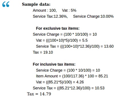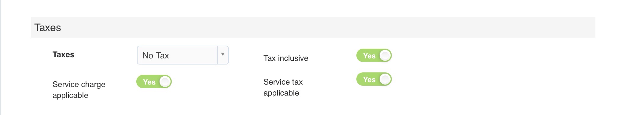 The Taxes section, contains fields Taxes, Tax inclusive, Service charge applicable and Service tax applicableIn the Taxes field, select the tax for the itemThe Tax Inclusive field displays No by default. Tap to change Tax Inclusive as YesYes - Indicates that Prices are Inclusive of TaxNo - Indicates that Prices are Exclusive of Tax The Service charge applicable field displays Yes by default. Tap to change Service charge applicable as NoYes - Indicates that Service charge would be applicable in the ordersNo - Indicates that Service charge would not be applied to the ordersThe Service tax applicable field displays Yes by default. Tap to change Service tax applicable as NoYes - Indicates that Service tax would be applicable in the ordersNo - Indicates that Service tax would not be applied to the orders