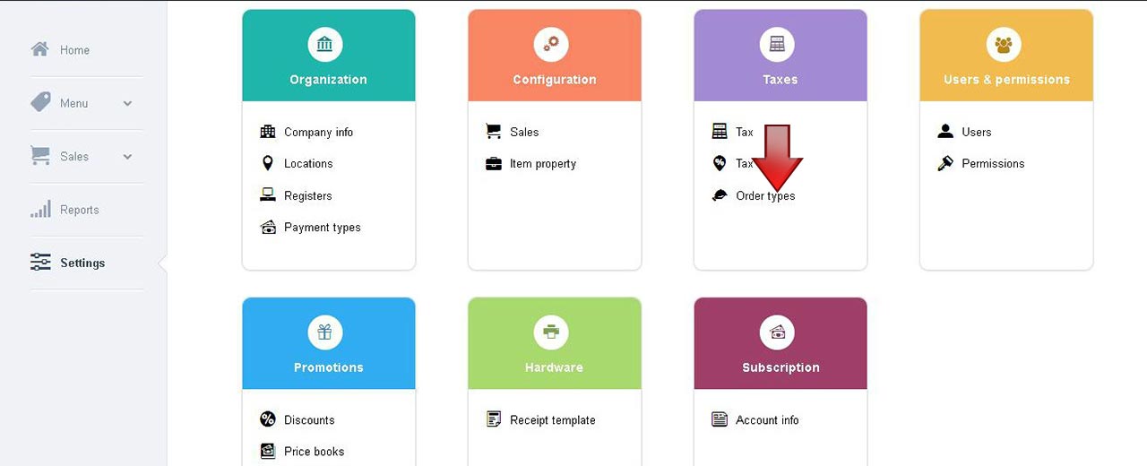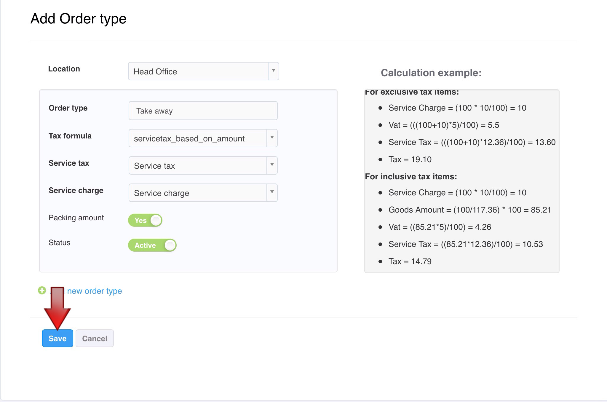 The Order type screen has fields Location, Order type, Tax formula, Service tax, Service charge, Packing amount, Status, Add new order typeIn the location field, select the location for which the order type has to be mappedIn the Order type field, enter the name of the order type. You can select an existing order type or select multiple order type for a single locationIn the Tax formula field, select from the drop down the desired formulaIn the Service tax field, select from the drop down optionsIn the Service charge field, select from the drop down optionsThe Packing amount field, is set No by default for that particular location. Tap to change the status as YesThe Status field, is Active by default. Click to change the status as InactiveBy selecting the Add new order type you can add multiple order type to a single location Note: Based on the Tax formula, Service tax and Service amount the calculation is depicted on the right pane with a sample data