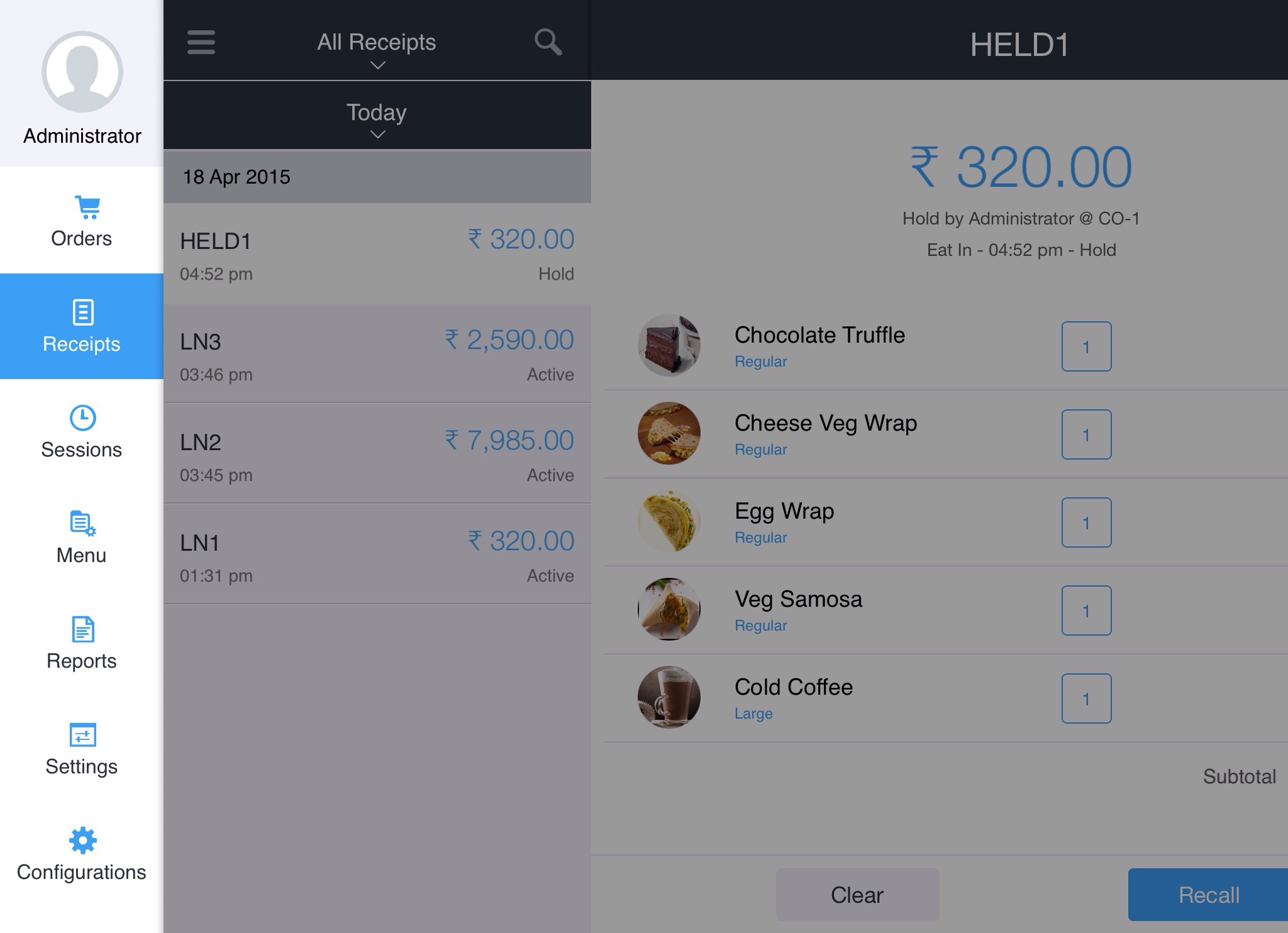 Receipts. Receipts screen is displayed