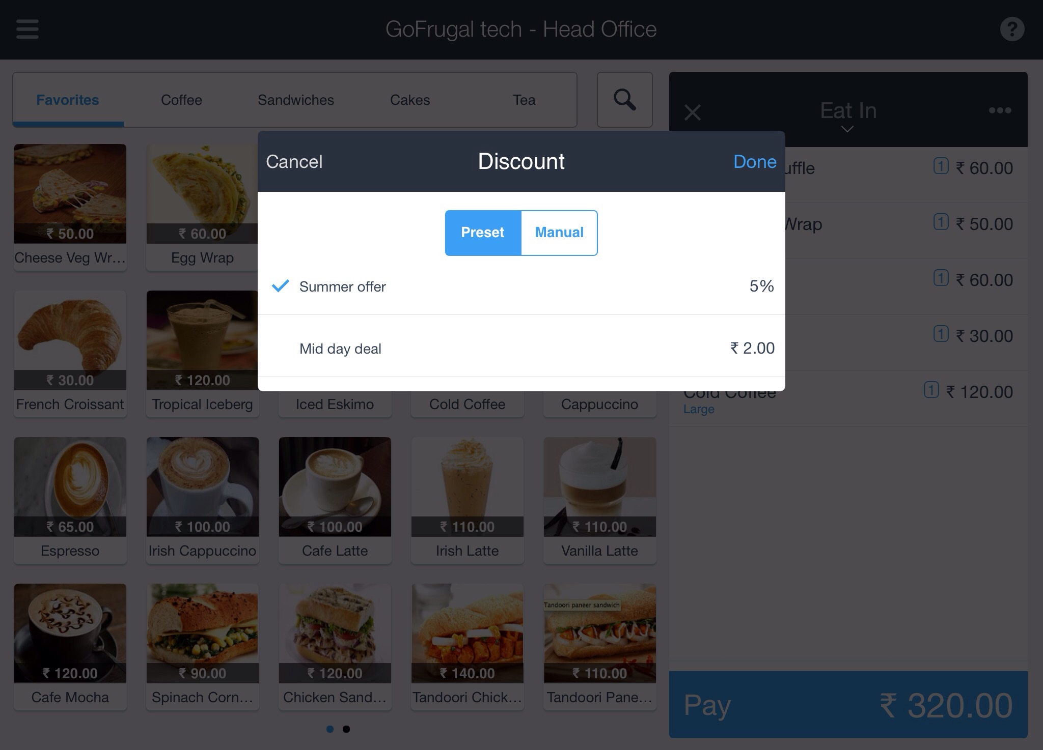 Preset, displays the predefined offers available. Refer > link to create a new discount offerManual, allows to offer discount using Percentage value or amount. The Reason for offering discount can be specified in the Enter reason text box 4. To complete the transaction follow step 6 & 7 from