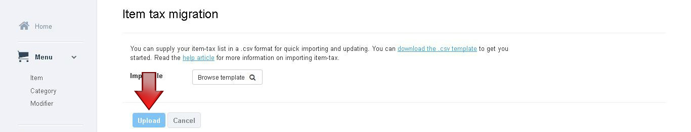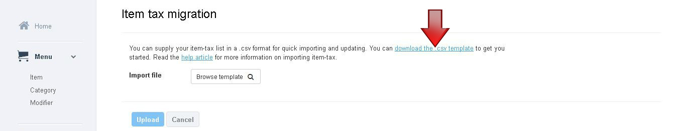 3. Item tax migration screen is displayed. Click on download the .CSV template.