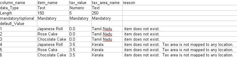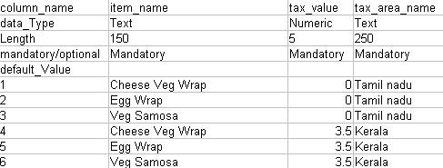 The item_name field, contains the name of the itemThe tax_value field, contains the value of the tax in percentageThe tax_area_name field, contains the name of the area with respect to the location The below image contains few items with sample data for reference