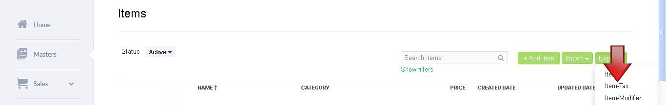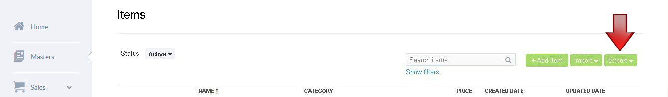 1. Select Masters > Item. An Items screen is displayed. Select Export.