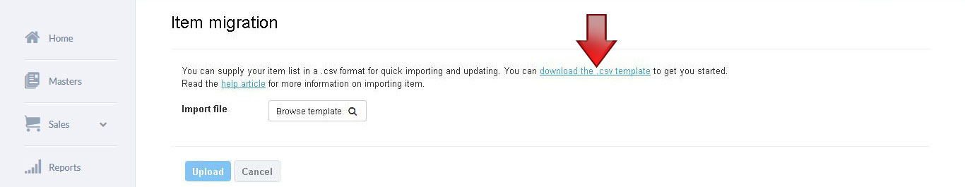 3. Item migration screen is displayed. Click on download the .CSV template