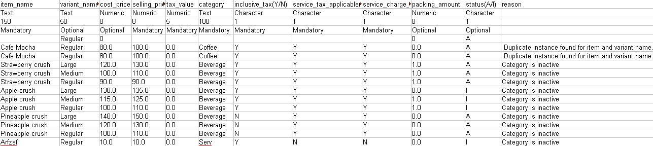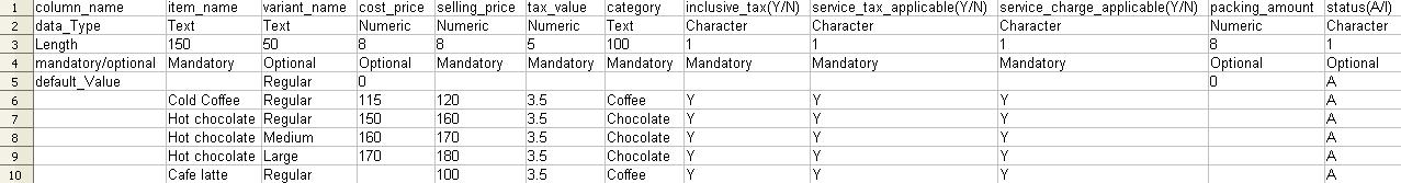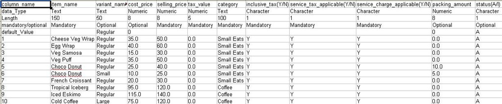 The item_name field, contains the name of the itemIn the variant_name field, contains the name of the variantIn the cost_price field, contains the purchase price of the itemIn the selling_price field, contains the selling price of the itemIn the tax_value field, contains the tax percentage for the itemIn the category field, contains the category of the itemIn the inclusive_tax field, contains Y if the price of the item is inclusive of the tax specified else enter NIn the service_tax_applicable, contains Y if service tax is applicable for the item else contains NIn the service_charge_applicable, contains Y if service charge is applicable for the item else contains NIn the packing_amount field, contains the packing amount of the item for your preferred order typeIn the status field, if the item status is active contains A else I The below image contains few items with sample data for reference