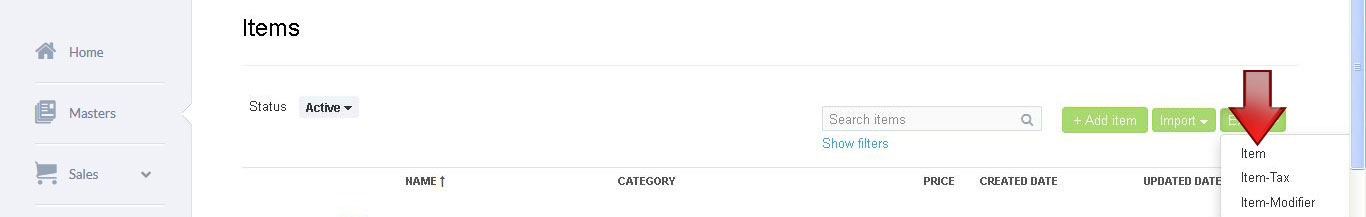 1. Select Masters > Item. An Items screen is displayed. Select Export