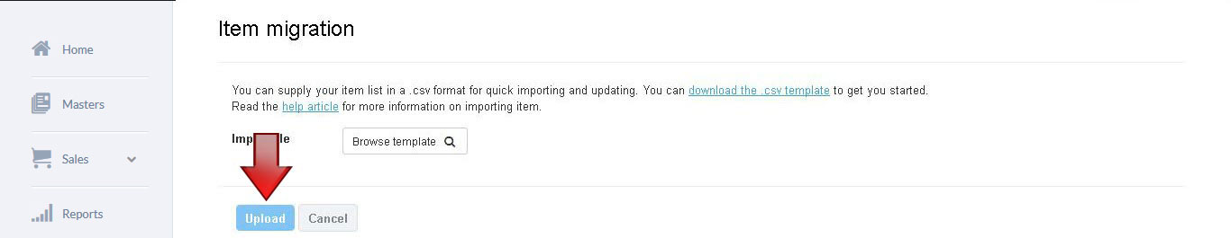 5. Upload the saved .csv file using the Browse template in the Item migration screen and click on Upload