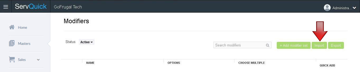 1. Select Masters > Modifier. Modifiers screen is displayed. Select Import
