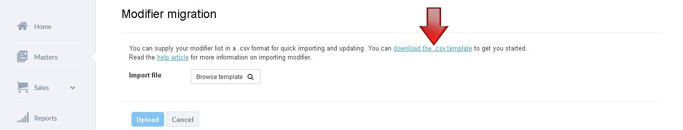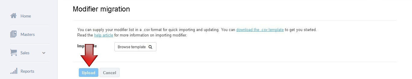 In the modifier_name field, enter the name of the modifierIn choose_multiple field, enter the status as Yes or NoYes - Allows to choose multiple modifier options for the same modifier set while taking orderNo - Allows to choose only one modifier option while taking orderIn option_name field, enter the name of the option In price field, enter the price of the optionIn option_status field, if the status is active enter A else I 4. Import the saved .csv file using the Browse template in the Modifier migration screen and click on Upload
