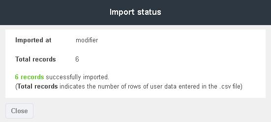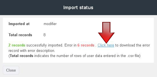 The message box Import status displays as below when the import is done successfully The message box Import status displays as below when an error occurs The error record sheet can be downloaded to understand the nature of the error Note: The same file can be imported after rectifying the errors for a successful import.