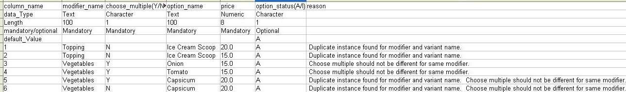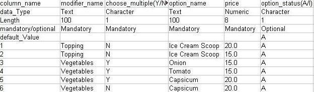 In the modifier_name field, contains the name of the modifierIn choose_multiple field, contains the status as Yes or NoYes - Allows to choose multiple modifier options for the same modifier set while taking orderNo - Allows to choose only one modifier option while taking orderIn option_name field, contains the name of the option In price field, contains the price of the optionIn option_status field, contains A if the status is active else I The below image contains few items with sample data for reference