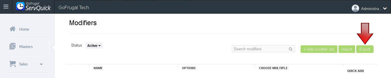 1. Select Masters > Item. A Modifiers screen is displayed. Select Export.